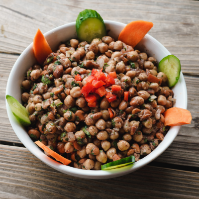 Chickpea Salad — A vibrant and protein-rich salad made with tender chickpeas tossed with tomatoes, red onion, and fresh cilantro in a tangy lemon-herb vinaigrette. This hearty vegan side is packed with flavor, fiber, and plant-based goodness. Great as a stand-alone salad or alongside your Mediterranean favorites. When mixed with pinto beans, this salad gains an additional layer of richness.